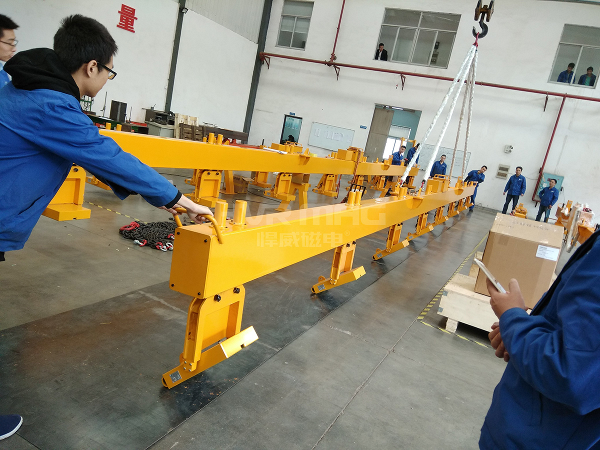 以下是悍威磁電最新生產(chǎn)的一套出口美國的側(cè)吊型鋼板吊磁力吊具試吊圖,額定起重能力為6噸,采用了6臺電永磁鐵聯(lián)合吊運的方式,幫助終端用戶實現(xiàn)對鋼板安全平穩(wěn)高效的搬運,技術(shù)上已經(jīng)超過美國,處于技術(shù)領(lǐng)先水平