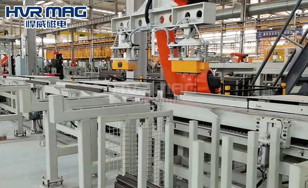 在汽車的生產(chǎn)過程中,利用電永磁吊具將薄鋼板等工件運送至數(shù)控機床進行切割時,由于電永磁吊具采用多點吸附方式,一方面不僅能避免薄鋼板在搬運過程中發(fā)生磕碰、甚至鋼板變形等現(xiàn)象,另一方面,由于電永磁吊具僅在充退磁瞬間0.1-2秒用電,因此可節(jié)約95%以上的電能。此外,在吊運薄板時,電永磁吊具可一次吊運起厚度為1.5mm-6mm的單張薄鋼板,確保不與第二張鋼板粘連,便于薄鋼板的上料,性能優(yōu)異又如此節(jié)能環(huán)保的設備誰能不愛?