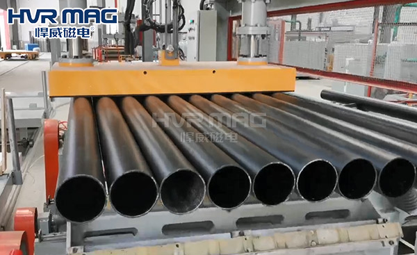 起重電永磁鐵安全可靠,搬運效率高,被應用于很多金屬工件的起重搬運上,尤其是國家目前大力發(fā)展碳中和,實現(xiàn)雙碳目標,這種低碳環(huán)保的起重設備無疑是大家的心頭好,然而國內對于電永磁產品的普及還不夠完全,還有很多企業(yè)只知道電磁鐵和永磁鐵,并不知道電控永磁,本篇悍威磁電小編和大家分享下起重電永磁鐵搬運鋼管的案例,讓大家對電永磁鐵有更多的了解。