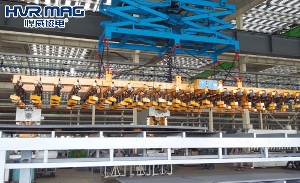 悍威磁電研發(fā)了矩陣式和密布式電永磁吊具系統(tǒng)。該鋼板切割上下料吊具產(chǎn)品特別適用于切割線上料、下料系統(tǒng),可以實現(xiàn)下 料一次完成,大大降低工人勞動強(qiáng)度,節(jié)省下料時間,提高設(shè)備使用效率,內(nèi)部無活動部件,后期0維護(hù), 同時,通過配套自動化執(zhí)行機(jī)構(gòu),此類產(chǎn)品可以實現(xiàn)鋼板切割線上下料過程的自動化。