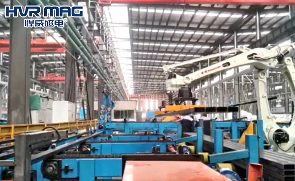面對液壓夾具所帶來的困擾,該智能裝備公司決定重新為車間的工業(yè)機器人挑選合適的末端抓手。既然液壓夾具不行,那就試試真空吸盤、磁力吸盤。經(jīng)過多方面參考與對比,該公司最終選擇了悍威磁電機器人專用電永磁夾具搬運成排方管。