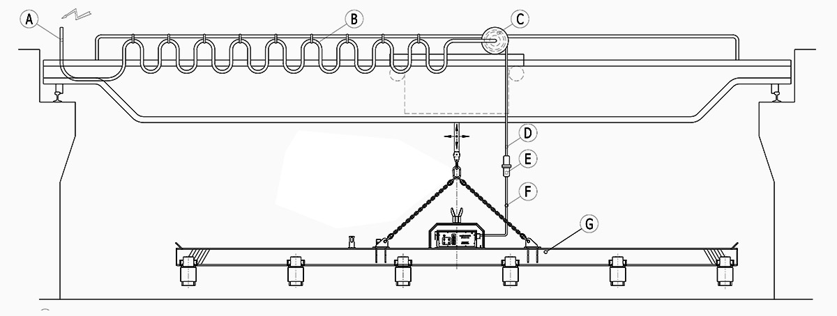 A:輸入電源 B:行車滑線 C:電纜卷筒 D:卷筒升降電纜 E:重載連接器 F:電永磁控制系統(tǒng)電源進線 G:橫梁