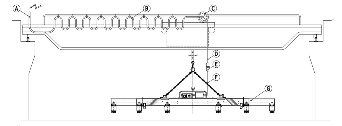 A:輸入電源 B:行車滑線 C:電纜卷筒 D:卷筒升降電纜 E:重載連接器 F:電永磁控制系統(tǒng)電源進(jìn)線 G:伸縮橫梁