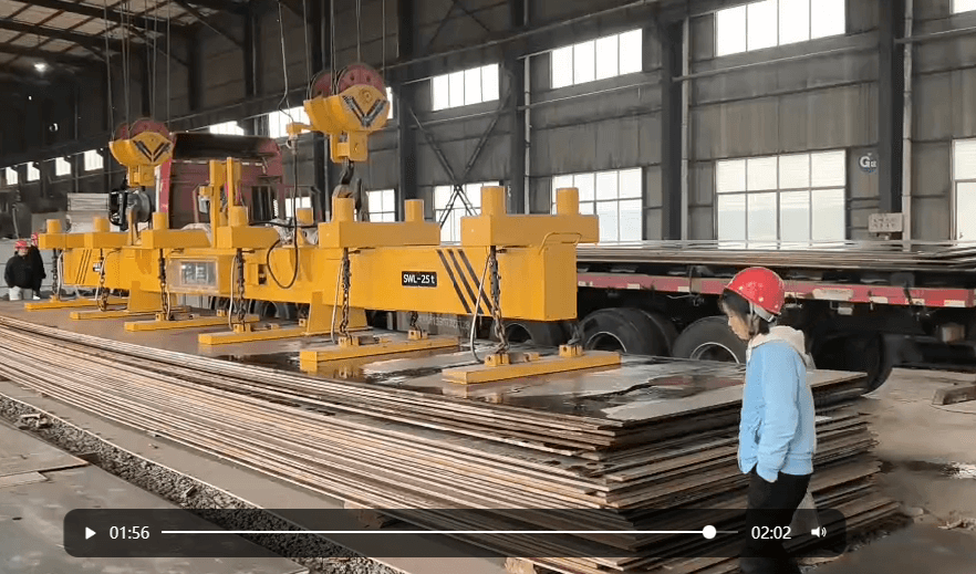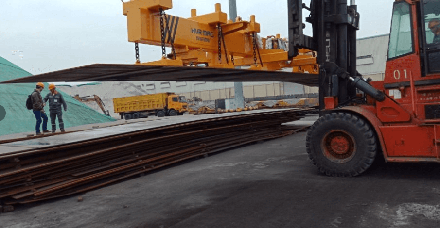 下面介紹一個案例, 一個1個小時要卸4車的工況,鋼板吊具以極快的速度運(yùn)行。