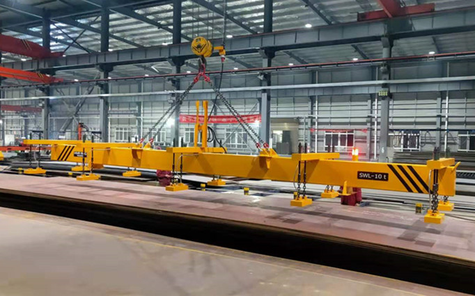 從圖片中可以看到,我們的客戶是河南省的一家鋼結(jié)構(gòu)公司,它利用我們的10噸工業(yè)吊裝磁鐵和橋式起重機,將一塊大的重型鋼板吊到鋼的預(yù)處理線上。這種類型的鉤下提升裝置在橫梁上裝有5組磁性模塊,適用于各種尺寸的板,因為磁性模塊可以針對各種尺寸的板進(jìn)行選擇性激活/停用。指示燈為綠色,表示磁體已成功磁化。