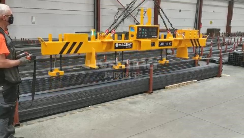圖中所示是國外某客戶的車間,使用悍威磁電生產(chǎn)的600kg充電式磁力吊具,吊運又薄又窄的鋼板。客戶要求一次吊起一張,且不粘連第二張板。