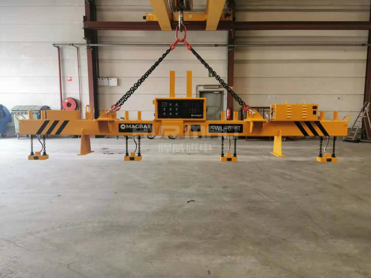 通常我們出貨的鋼板磁力吊具都是長磁極或者橫梁兩側(cè)對稱分布的磁鐵模塊的,用來吊運常規(guī)尺寸寬度的板材。那窄鋼板該如何吊運呢?別擔(dān)心,悍威也可定制如下圖這種充電式薄板磁力吊。